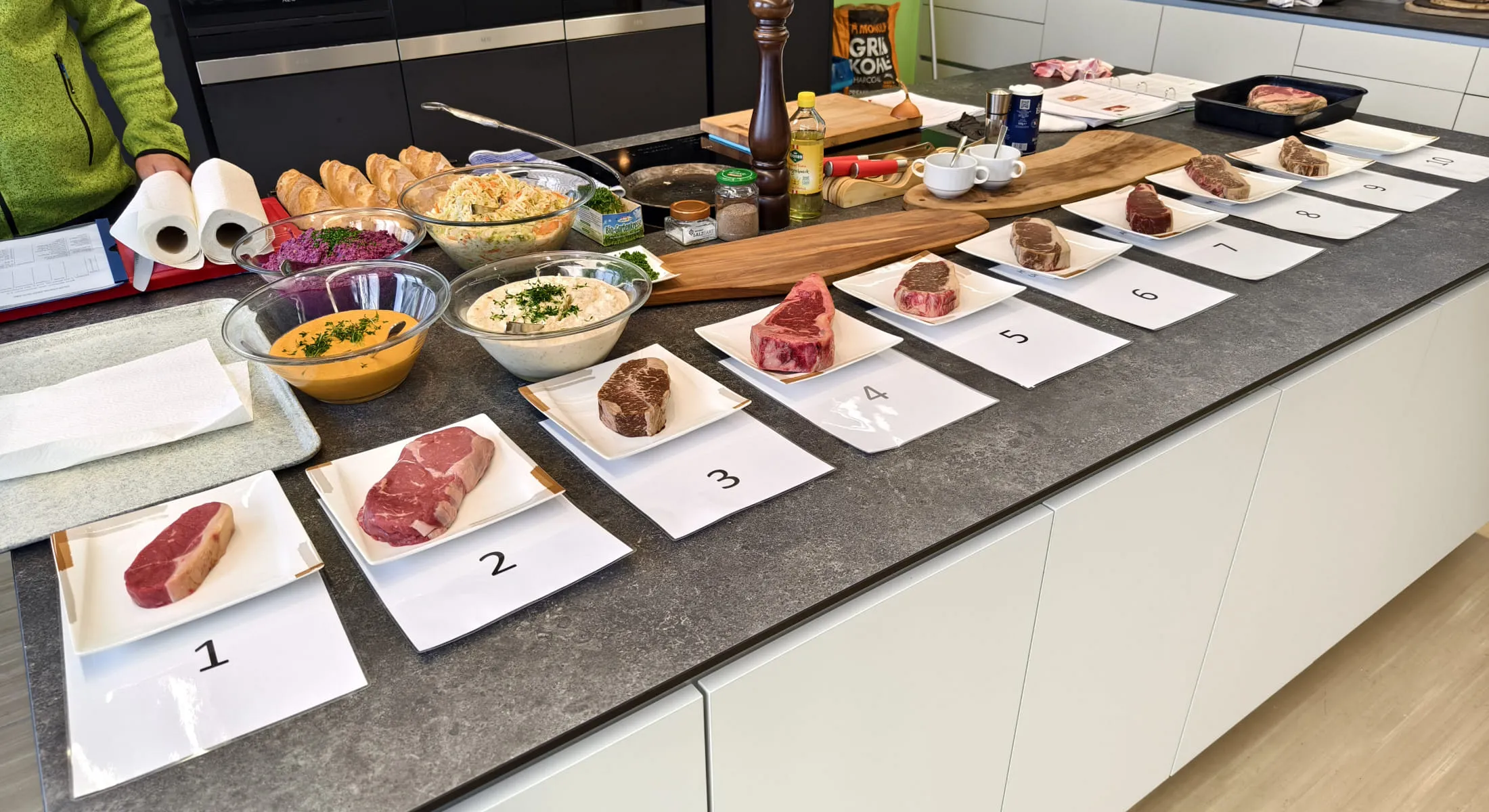 Wir haben uns intensiv dem Thema Steakqualität gewidmet — ausschließlich Rumsteak, sehr unterschiedliche Herkunft: Heimisch, Uruguay, USA und sogar Kobe aus Japan.